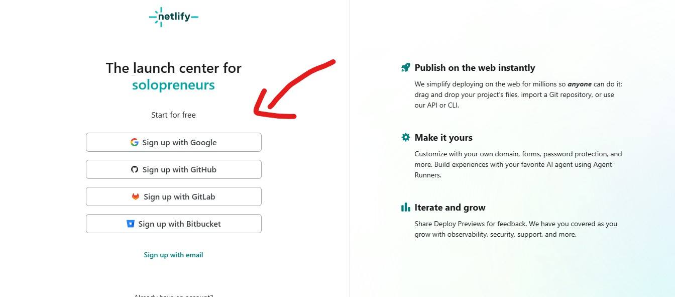 First, you need to create an account on Netlify. Go to the Netlify website and click on the Sign Up button. You will see different options to create an account, but the easiest way is to sign up with your Google account. Just click on Sign up with Google, and your account will be ready in less than a minute. If you already have an account, you can simply log in instead.